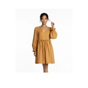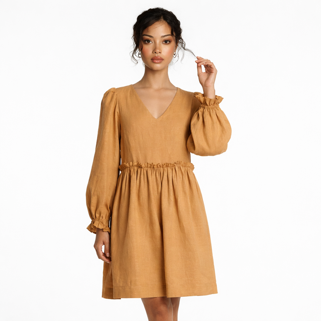 - Diseño: Escote en V en la parte delantera, con mangas abullonadas anchas y románticas. El bajo presenta volantes fruncidos que aportan movimiento y ligereza.